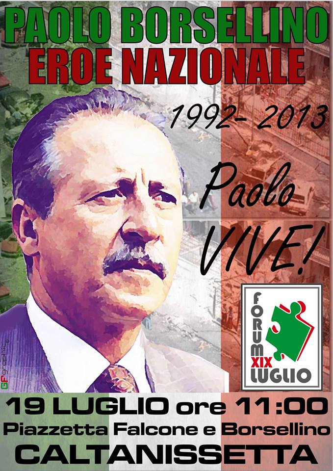 Venerdi 19 Luglio la cerimonia in ricordo della strage avrà inizio alle ore 11 e si svolgerà nella piazzetta Falcone e Borsellino antistante il Palazzo di Giustizia di Caltanissetta. Alla manifestazione sono state invitate tutte le autorità civili e militari e le associazioni attive sul territorio. Organizzatori della giornata oltre Fabrizio Parla, Giuseppe Fiocco e Calogero Munì. A far parte del Forum un folto numero di giovani che nel pomeriggio si recheranno a Palermo per la consueta fiaccolata che terminerà in Via D'Amelio.