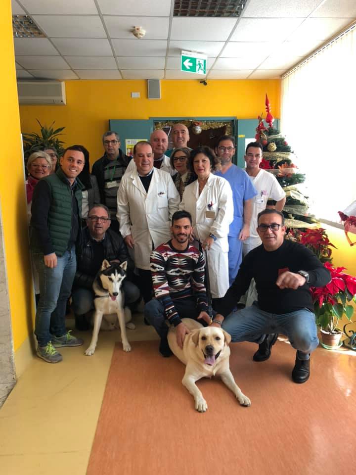 Il progetto “Teniamoci per la zampa” nasce dalla volontà di far trascorrere ai pazienti e ai familiari, che spesso passano intere giornate accanto ai propri cari, del tempo con i cani, coinvolgendoli in attività spesso ludiche e di contatto con l’animale. I meravigliosi terapisti a 4 zampe, un siberian husky di un anno Jack ed un delizioso labradror di 4 anni di nome Leo per la prima volta hanno fatto ingresso in ospedale.