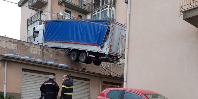 Un tir per cause in corso di accertamento è finito in bilico sui tetti di alcuni magazzini a Caccamo nel Palermitano. Il grosso mezzo è sospeso e minaccia una palazzina dove abitano sei famiglie. I carabinieri e i vigili del fuoco hanno fatto evacuare l'immobile. Sono tuttora in corso le operazioni per cercare di rimuovere il veicolo ed evitare gravi danni alla costruzione. Al momento le famiglie sono tutte fuori dalle abitazioni e in attesa che l'allarme possa rientrare.