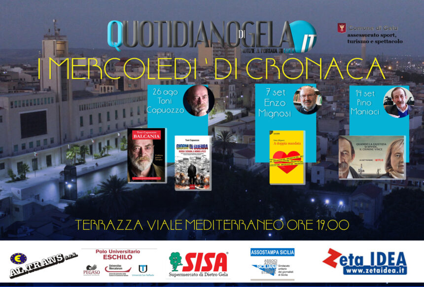 Sarà una terza edizione di altissimo livello quella de “I Mercoledì di cronaca”, promossa dalla società Finmedia, editrice del Quotidiano di Gela e telegela. Cambia la location, con la terrazza di Viale Mediterraneo che ospiterà scrittori e giornalisti che con le loro opere e inchieste hanno tracciato un solco nel panorama giornalistico nazionale. Gli appuntamenti, tutti in programma alle 19, sono i seguenti: VENERDì 26 AGOSTO – TONI CAPUOZZO PRESENTA “BALCANIA” E “GIORNI DI GUERRA”. 7 SETTEMBRE – ENZO MIGNOSI PRESENTA “A DOPPIA MANDATA” 14 SETTEMBRE – IL CASO SAGUTO ED IL GIORNALISMO D’INCHIESTA – INCONTRO CON PINO MANIACI La rassegna è realizzata con il Patrocinio del Comune di Gela -Assessorato allo Sport, Turismo e Spettacolo e di Assostampa Sicilia.