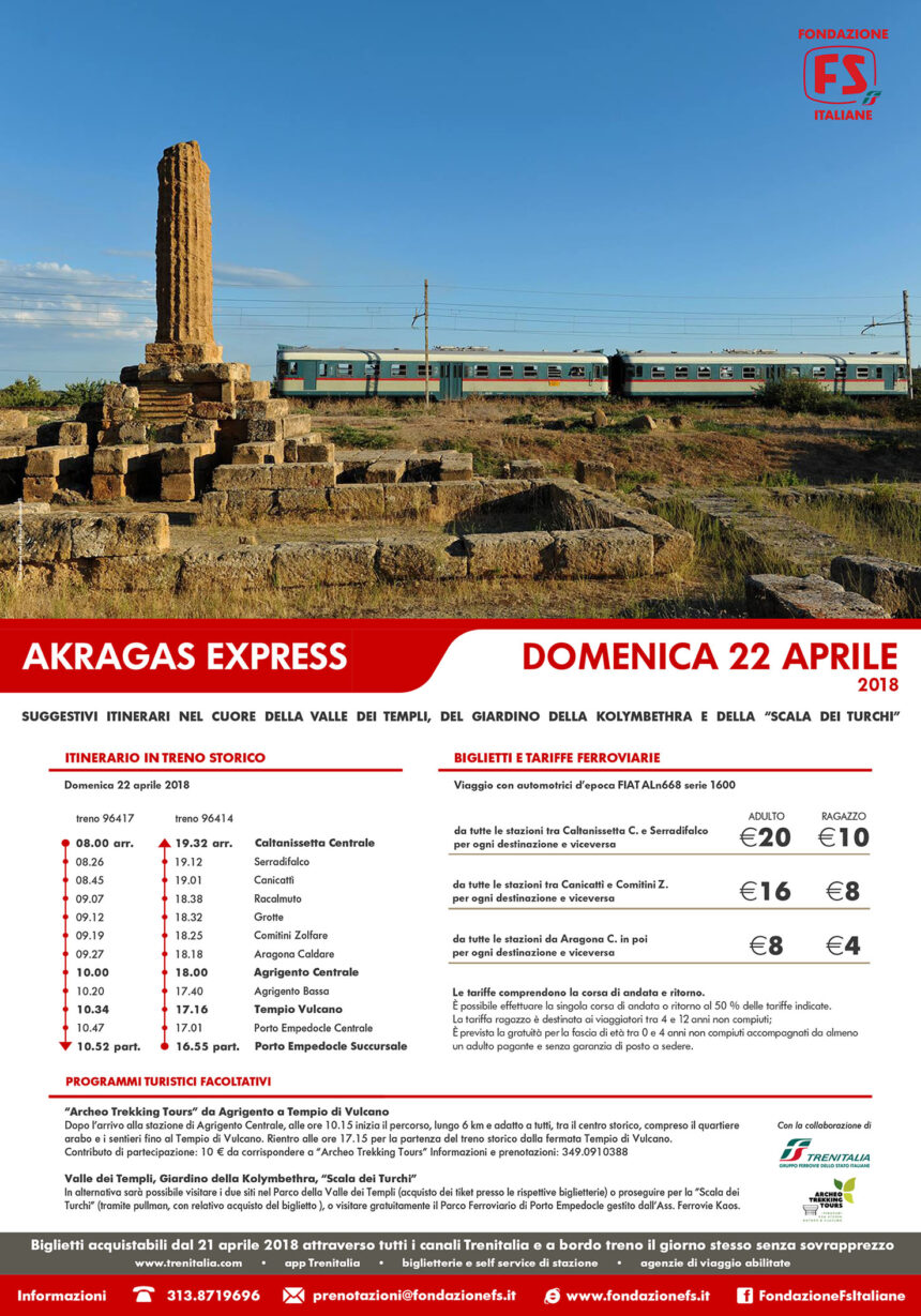 Sarà una domenica di primavera a contatto con la natura e le bellezze paesaggistiche. Il prossimo 22 aprile dalla stazione di Caltanissetta Centrale partirà il treno storico “Akragas Express” diretto ad Agrigento Centrale e Porto Empedocle. Ai viaggiatori sarà offerta l’opportunità di riscoprire il territorio da un altro punto vista, coniugando la bellezza del viaggio in treno storico all’”archeotrekking”.