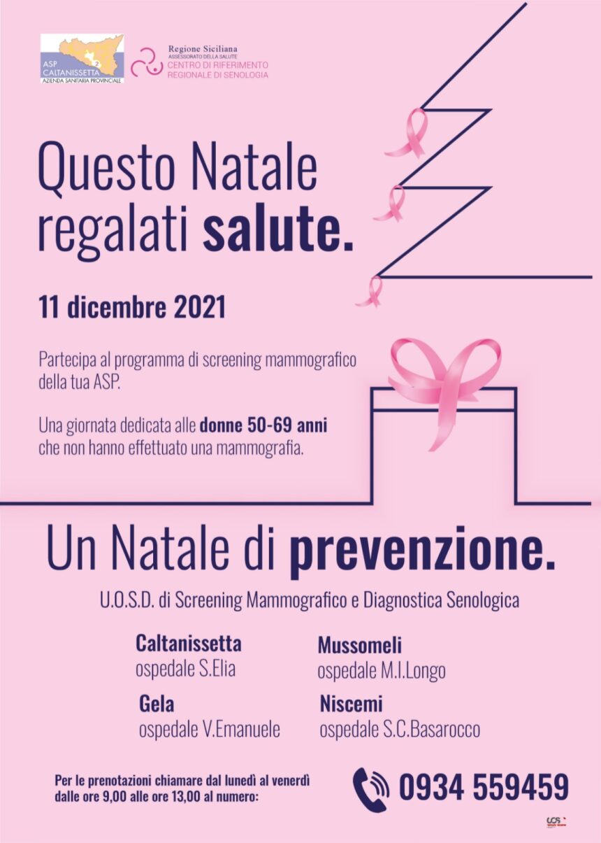 Giorno 11 Dicembre l’Asp di Caltanissetta nel regalare un "Natale di salute e prevenzione" propone una giornata dedicata alla prevenzione secondaria del tumore della mammella. A comunicarlo è la responsabile dell’UOSD Screening oncologico ca. della mammellla Dott.ssa Giuseppina Guadagnino. Negli ospedali della Provincia di Caltanissetta sedi dello Screening Mammografico, saranno effettuate gratuitamente, esami di mammografia alle donne di età compresa tra i 50 ed i 69 che ancora non hanno avuto la possibilità di aderire al programma di screening ed eseguire un controllo mammografico. Per aderire all’iniziativa dell’ASP è sufficiente telefonare al numero unico di prenotazione 0934559459 valido per tutta la provincia, e programmare l’esame nella sede ospedaliera più vicina. L’esame mammografico può essere effettuato la mattina dalle ore 9,00 alle ore 13,00 ed il pomeriggio dalle ore 15,00 alle ore 19,00. Come sempre saranno garantite tutte le norme anti-covid di distanziamento e sanificazione delle apparecchiature.