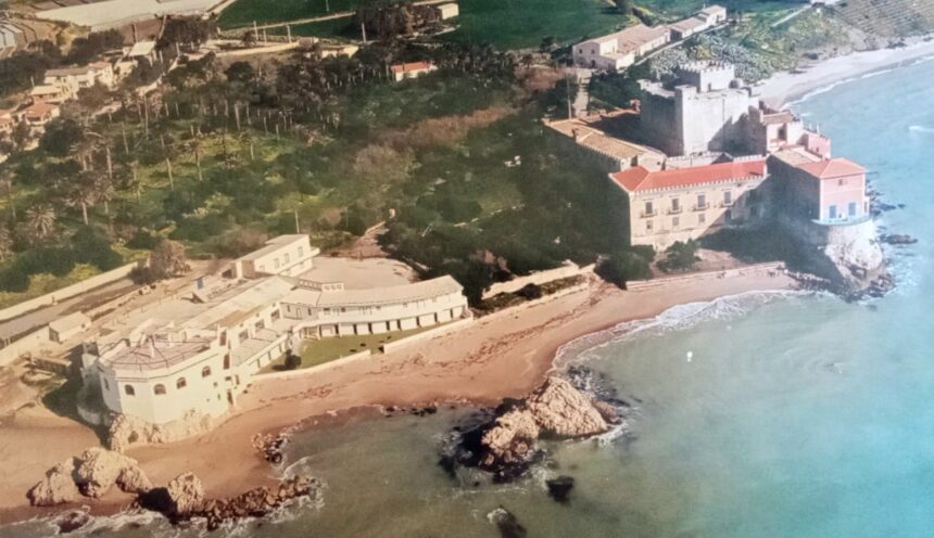 (nella foto allegata: sulla destra il Castello di Falconara – sulla sinistra il vecchio “Lido Sorriso” demolito nel 2005, nella stessa area oggi sarebbe stata rilasciata la concessione per un nuovo stabilimento”)