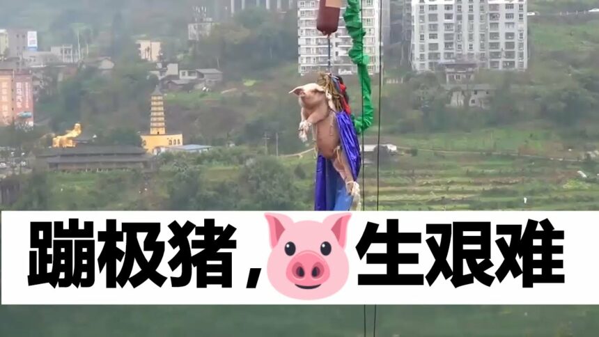I gestori di un nuovo parco a tema hanno costretto un maiale a fare bungee jumping per promuovere l’inaugurazione della struttura.